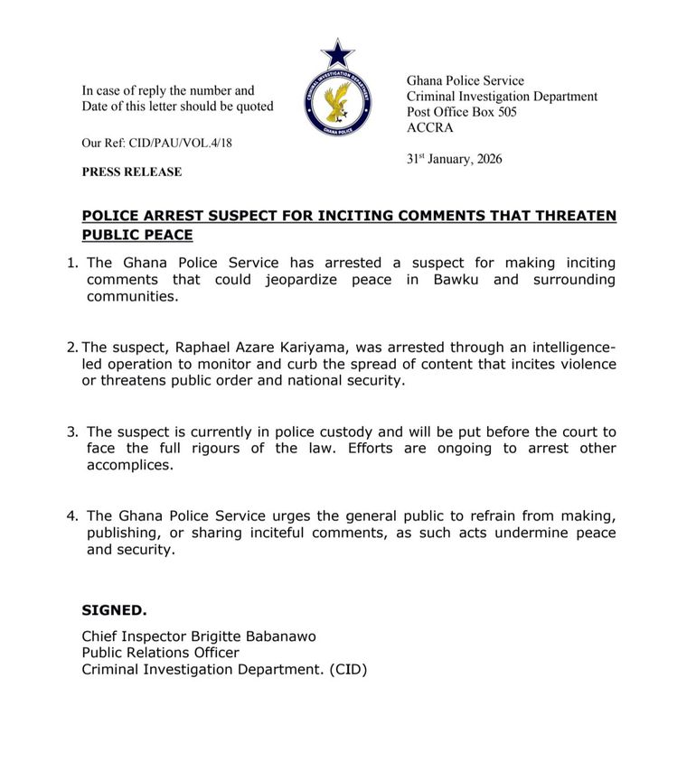 The Ghana Police Service has arrested a man accused of making comments authorities say could inflame tensions and threaten public peace in Bawku and nearby communities, an area that has experienced recurring unrest in recent years.