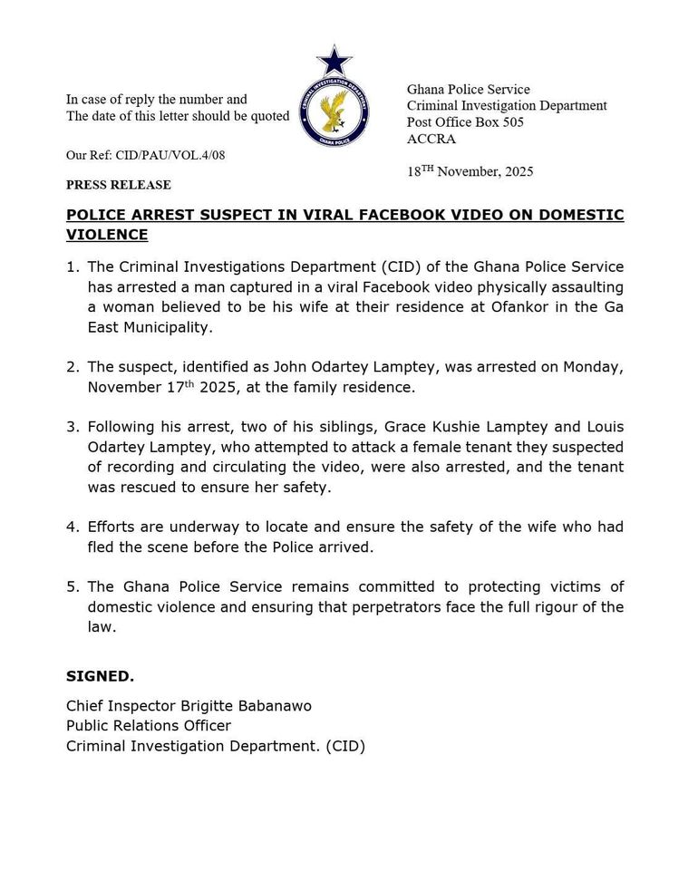 The suspect was seen beating his wife naked in the house. The suspect, identified as John Odartey Lamptey, was picked up on Monday, November 17, 2025, at the family residence after the disturbing video sparked public outrage online.