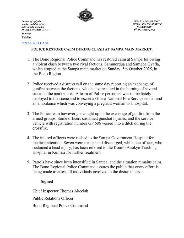 The Bono Regional Police Command said it has intensified patrols across Sampa to maintain peace and prevent further clashes. It also urged community leaders and residents to cooperate with ongoing investigations to sustain peace and ensure those involved in the violence are brought to justice.