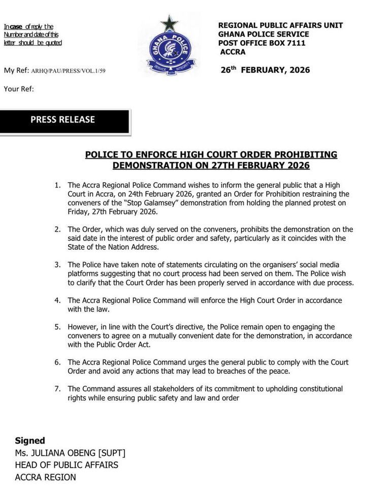 The Ghana Police Service (Accra Regional Command) says it will enforce a High Court order restraining the planned “Stop Galamsey” protest scheduled for Friday, 27 February 2026, a date that clashes with President John Dramani Mahama’s State of the Nation Address in Parliament.