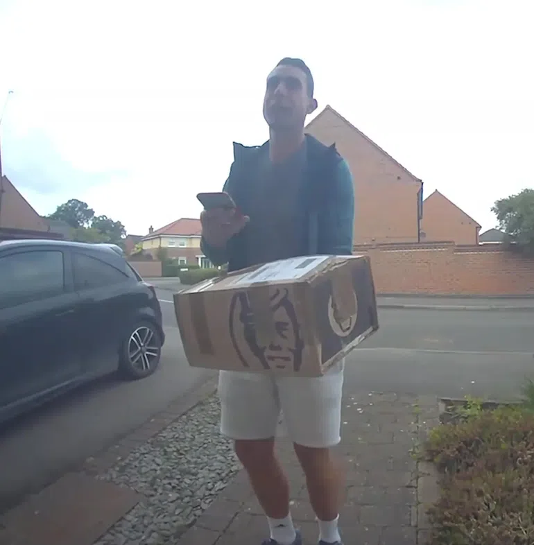 A couple got the shock of their lives when they spotted the 42-year-old on their doorbell camera dropping off a package at their house.