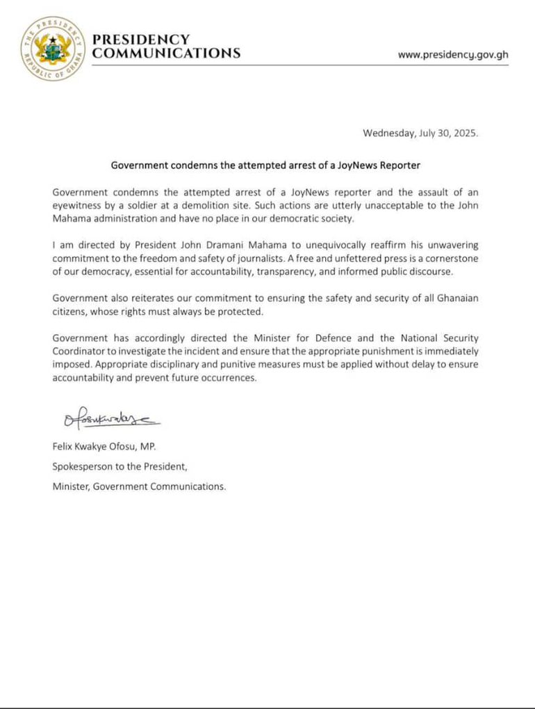 I am directed by President John Dramani Mahama to unequivocally reaffirm his unwavering commitment to the freedom and safety of journalists. A free and unfettered press is a cornerstone of our democracy, essential for accountability, transparency, and informed public discourse.