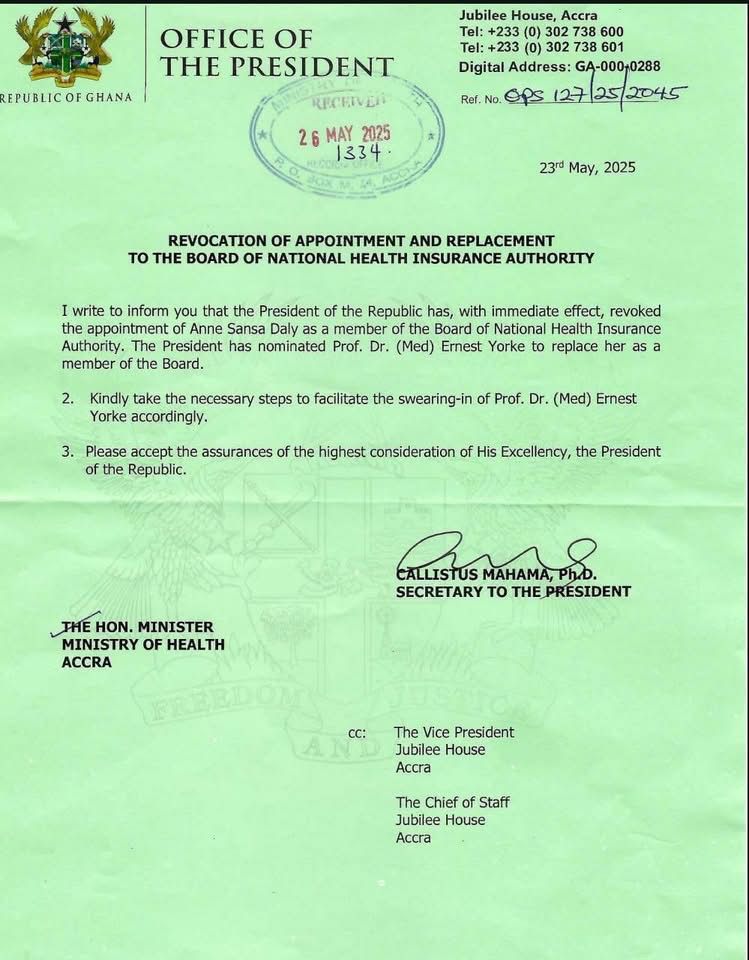 The decision, which takes immediate effect, was communicated in a letter dated 23 May 2025, signed by the Secretary to the President, Dr Callistus Mahama, and addressed to the Minister of Health, Kwabena Mintah Akandoh.