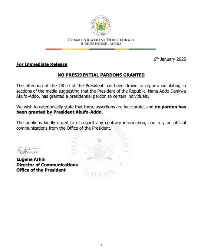 The attention of the Office of the President has been drawn to reports circulating in sections of the media suggesting that the President of the Republic, Nana Addo Dankwa Akufo-Addo, has granted a presidential pardon to certain individuals.