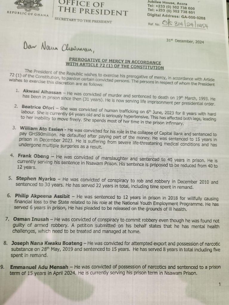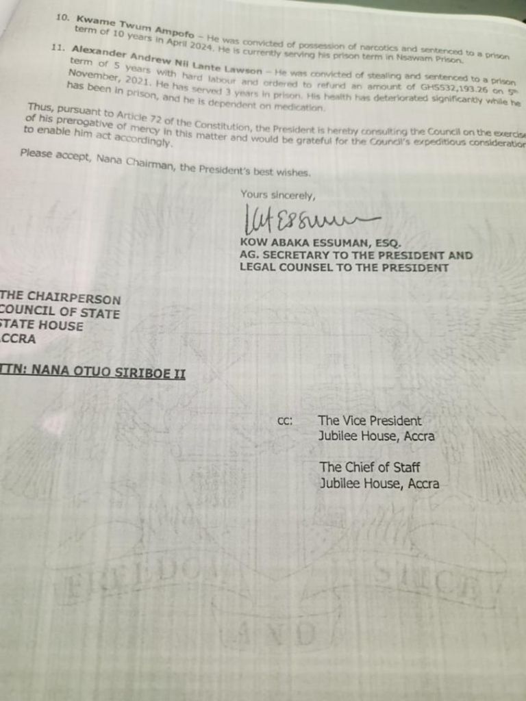 A letter dated 31st December, signed by Kow Abaka Essuman, Acting Secretary and Legal Counsel to the President, stated that the decision was in line with Article 72 (1) of the Constitution. The letter further indicated that Ato Essien is suffering from severe life-threatening medical conditions and has undergone multiple surgeries as a result.