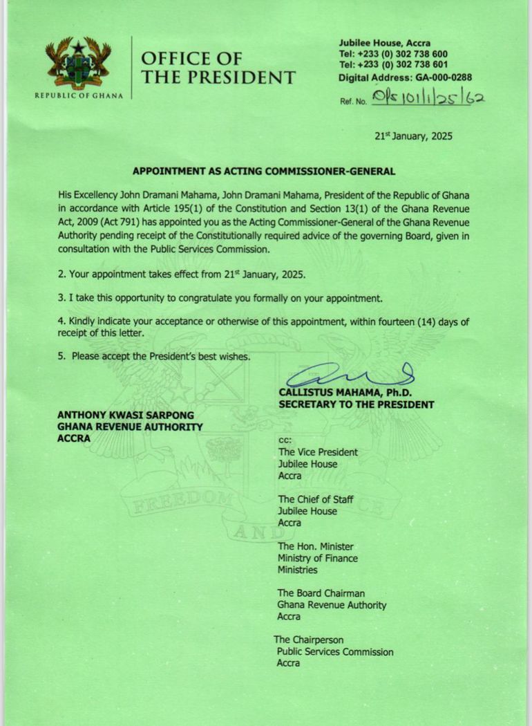 President John Dramani Mahama has appointed Anthony Kwasi Sarpong as the Acting Commissioner-General of the Ghana Revenue Authority (GRA), effective 21st January 2025.