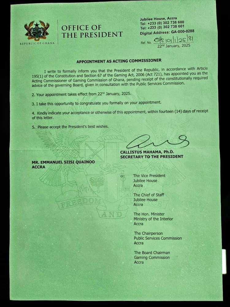 I write to formally inform you that the President of the Republic, in accordance with Article 195(1) of the Constitution and Section 67 of the Gaming Act, 2006 (Act 721), has appointed you as the Acting Commissioner of the Gaming Commission of Ghana, pending receipt of the constitutionally required advice of the governing board, given in consultation with the Public Services Commission.