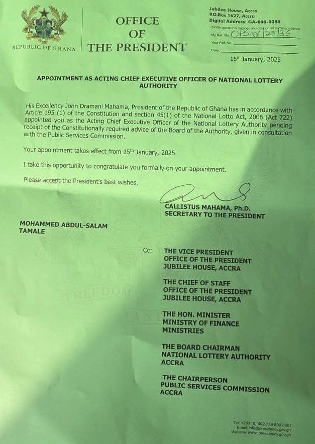 President John Dramani Mahama has appointed Mohammed Abdul-Salam as the acting Chief Executive Officer of the National Lottery Authority (NLA) after the resignation of Samuel Awuku on Monday, 13th January 2025.