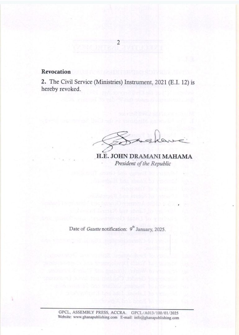 President John Dramani Mahama has restructured his administration's ministries, reducing their number from 30 to 23. This decision was taken through an Executive Instrument (E.I.) signed on Thursday, 9th January 2025.