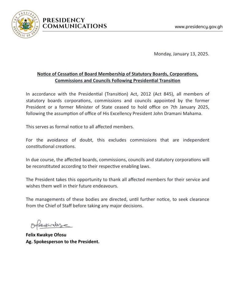 President John Dramani Mahama has dismissed board members of statutory boards, corporations, commissions, and councils appointed under the former Akufo-Addo administration.