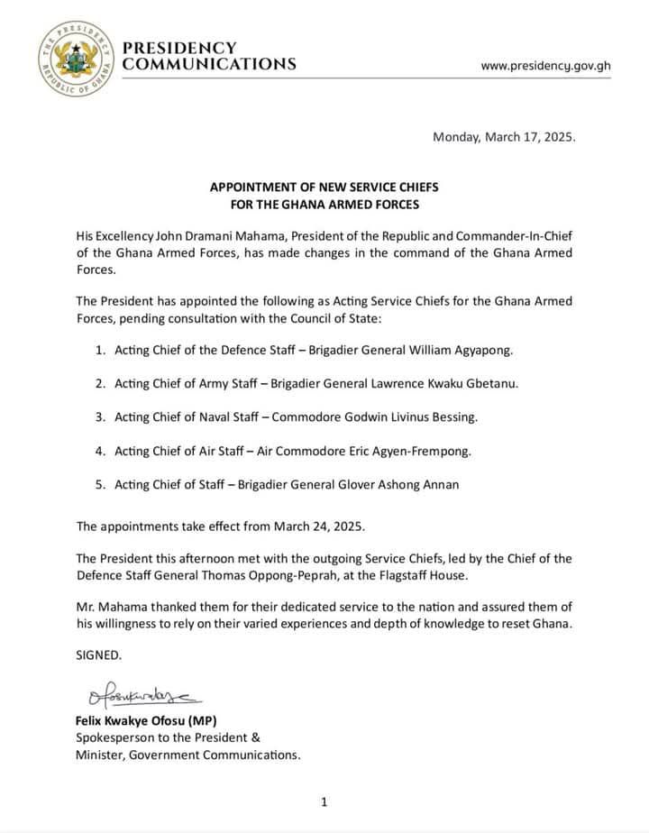 The decision, along with a major reshuffle in the Ghana Armed Forces, was announced in a statement dated 17 March and signed by the Minister for Government Communications, Felix Kwakye Ofosu.