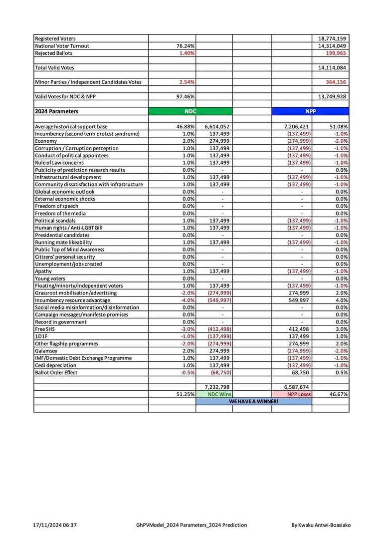 Unlike Mussa, KAB is not a pollster. Kwaku's methodology could be described, roughly, as a multi-variable analysis of the key factors or variables around which an election would turn, with each variable assigned a weighting based on its perceived importance to voters in the election. I'm sure Kwaku can do a much better job than I of describing his #GhPVModel - Presidential Election Prediction Model.