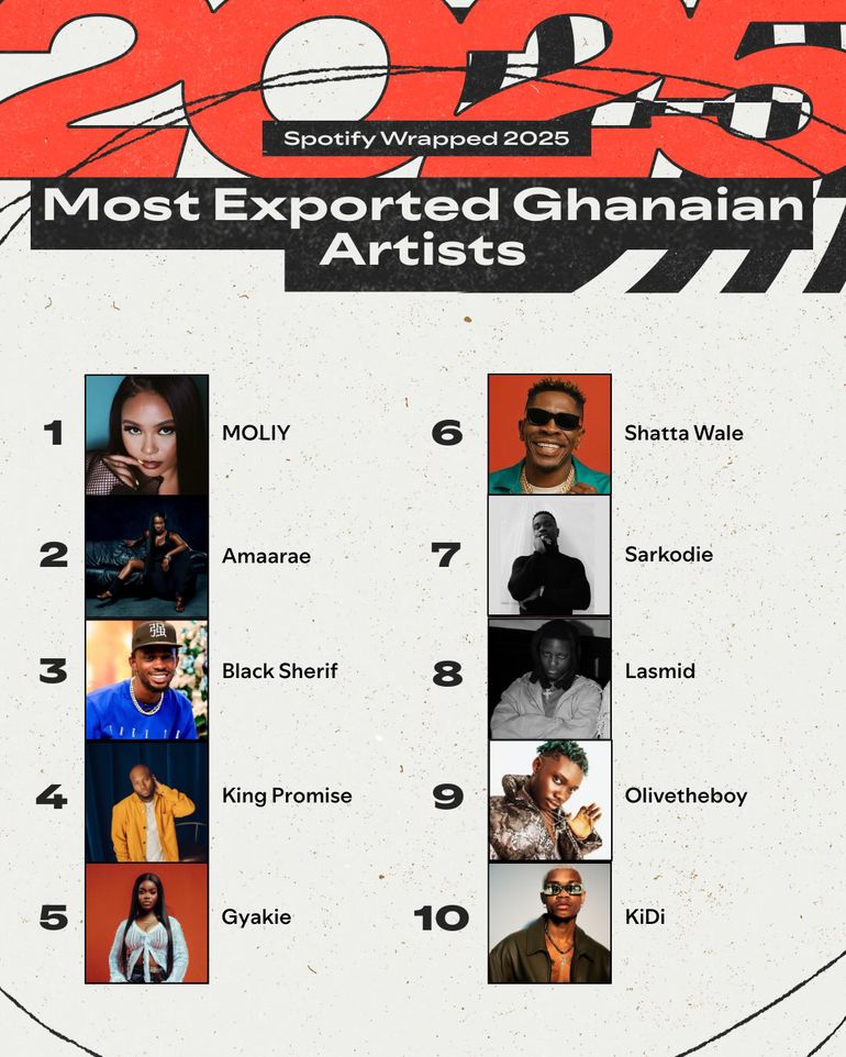 The 2025 streaming data reveals a layered story. While Black Sherif’s domestic dominance remains unmatched, artistes such as MOLIY and Amaarae are leading Ghana’s international charge. Notably, female artistes featured prominently among the most-exported acts, signalling a shift in global representation.