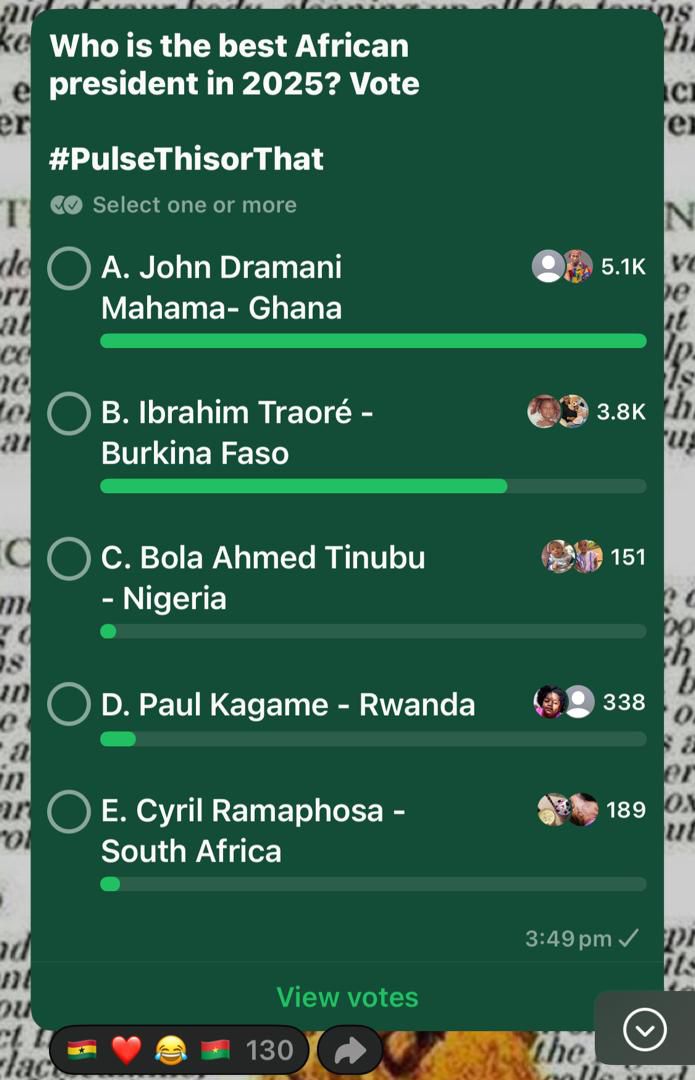 This razor-thin difference underscores the diversity of opinion within the Pulse Ghana audience and highlights the split in leadership preferences among different segments of the African public.