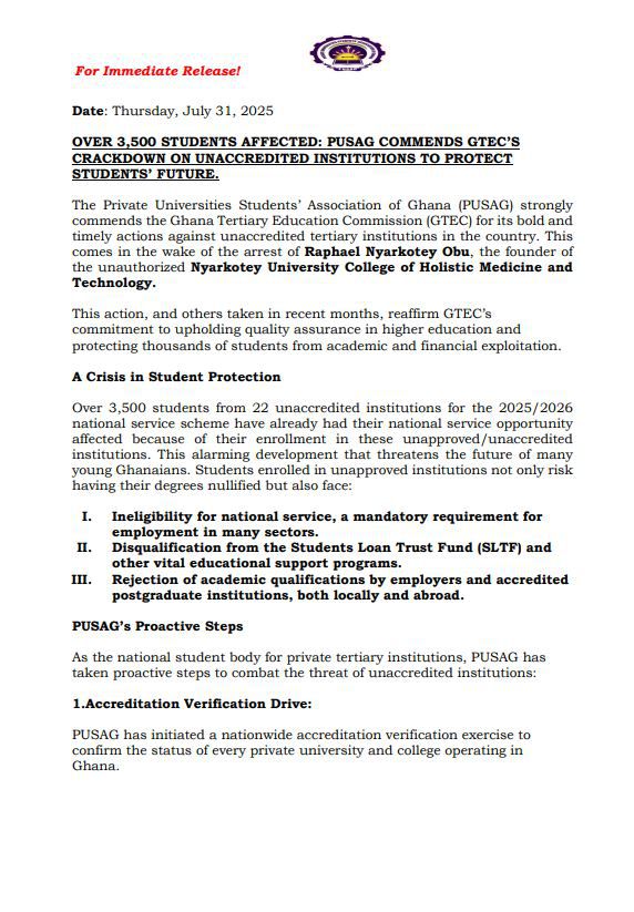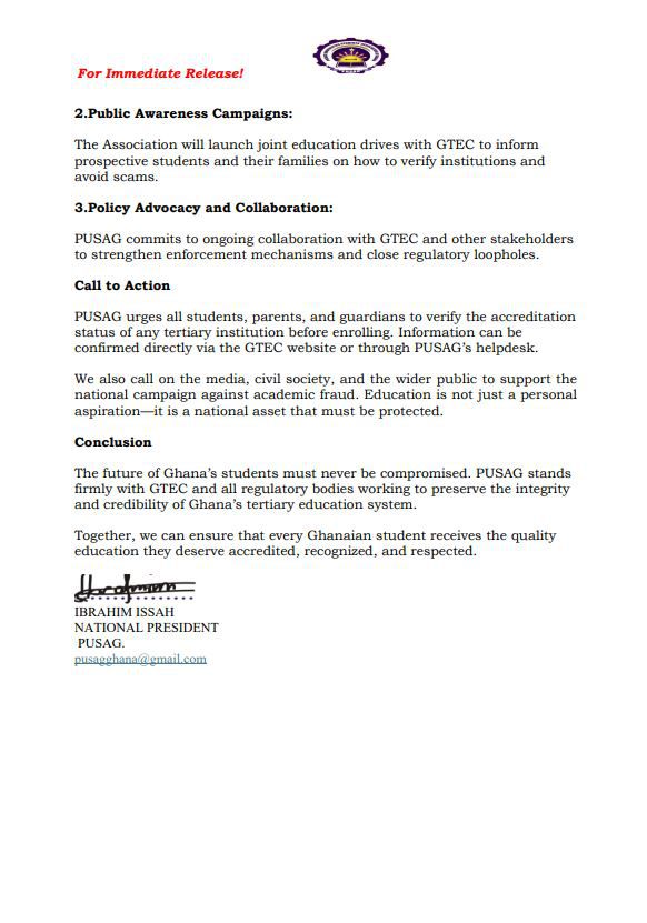 In a public statement commending the Ghana Tertiary Education Commission (GTEC) for intensifying its clampdown on such institutions, PUSAG's National President, Ibrahim Issah, urged vigilance from all stakeholders. “PUSAG urges all students, parents, and guardians to verify the accreditation status of any tertiary institution before enrolling,” he said. “Information can be confirmed directly via the GTEC website or through PUSAG’s helpdesk.”