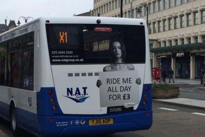 New Adventure Travel Group( NAT), a South Based hire and land transport solution provider inscribed the back of its buses with a large advert depicting men and women, who appear to be topless, holding signs that read: "Ride me all day for £3".