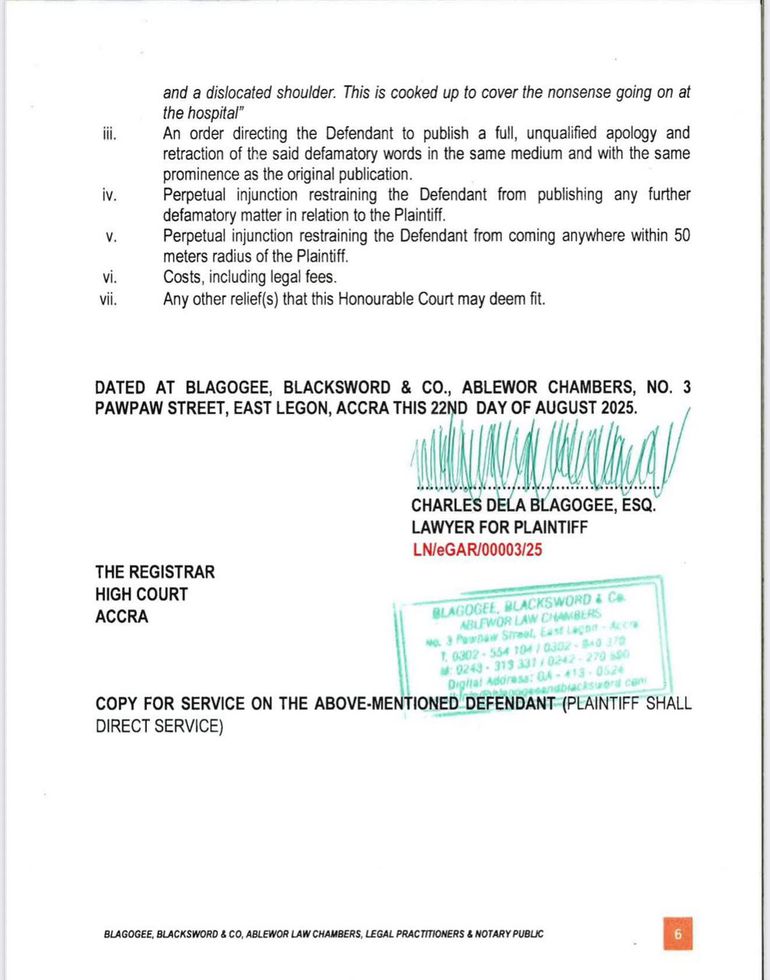 Bortei’s legal team, led by Charles Delali Blagogee of Blagogee, Blacksword & Co., argues that these public comments have tarnished her professional reputation, exposed her to public ridicule, and damaged her credibility as a healthcare worker.