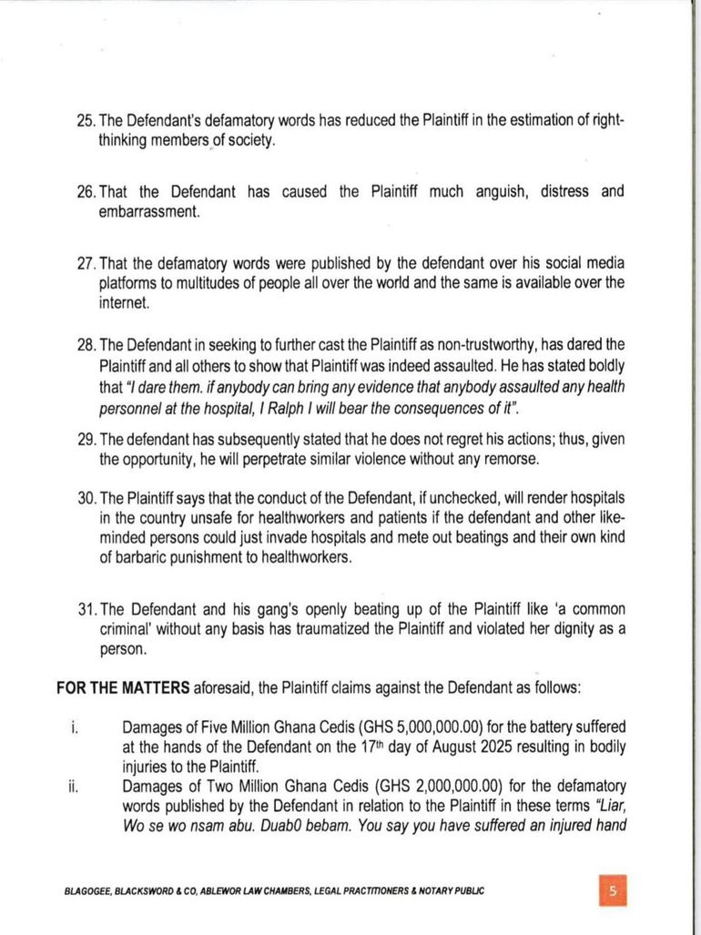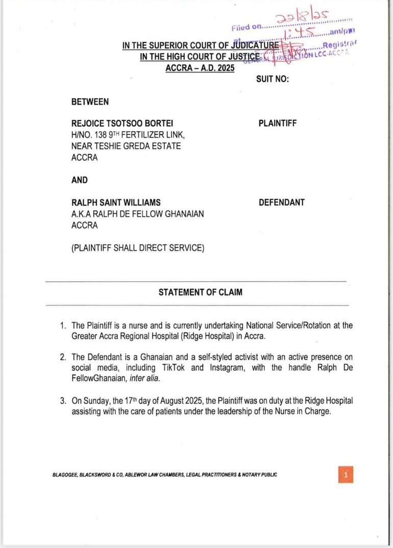 Rejoice. Tsotso Bortei, a nurse at Ridge Hospital, has filed a GHS 7 million lawsuit against social media personality and activist Ralph Saint Williams, popularly known as Ralph De Fellow Ghanaian.