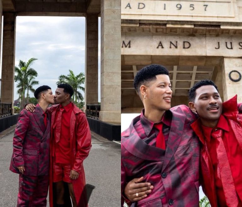 The two South African men, identified as Rue and Lue, sparked a social media storm after posting images of themselves kissing beneath Ghana’s iconic Independence Arch. Clad in matching red-themed outfits, the couple posed affectionately at the historic site, which is widely regarded as a symbol of national pride and liberation.