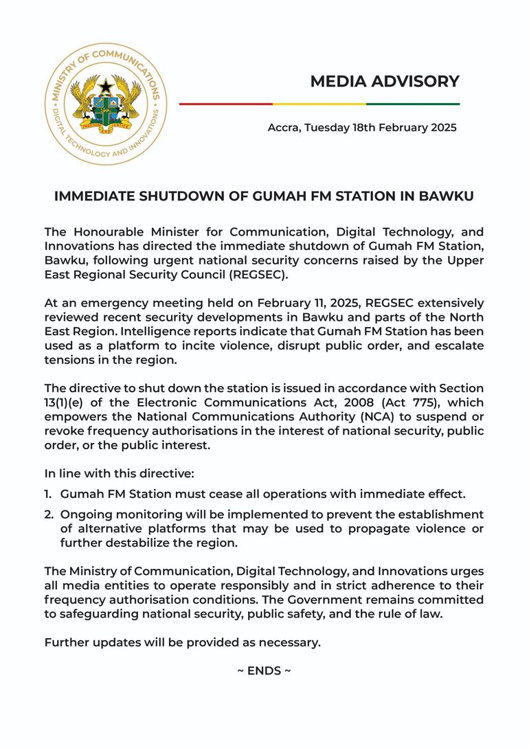 The first directive, ordering the closure of Gumah FM in Bawku, follows an emergency Regional Security Council meeting held on 11th February 2025. The station was accused of inciting violence, disrupting public order, and escalating ongoing tensions in the region.