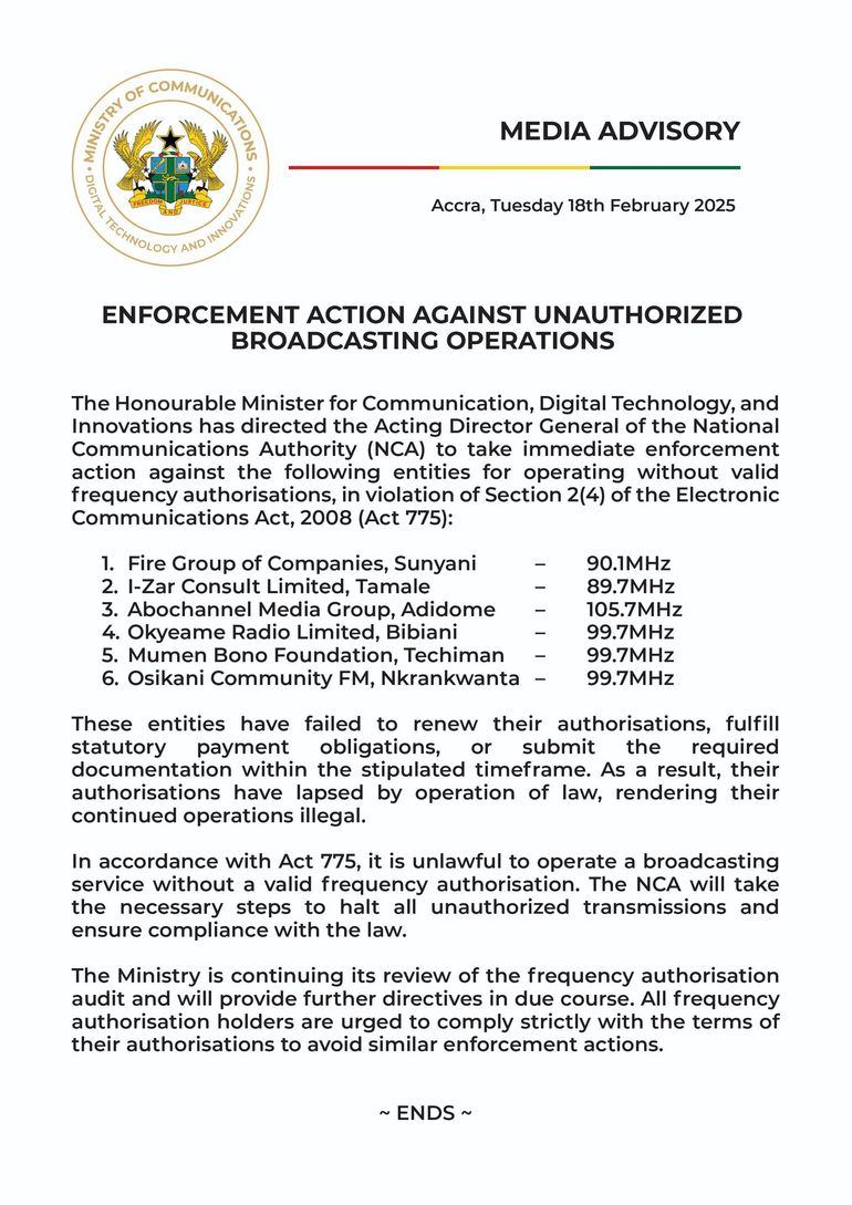 The directive to shut down the station is issued in accordance with Section 13(1)(e) of the Electronic Communications Act, 2008 (Act 775), which empowers the National Communications Authority (NCA) to suspend or revoke frequency authorisations in the interest of national security, public order, or the public interest.