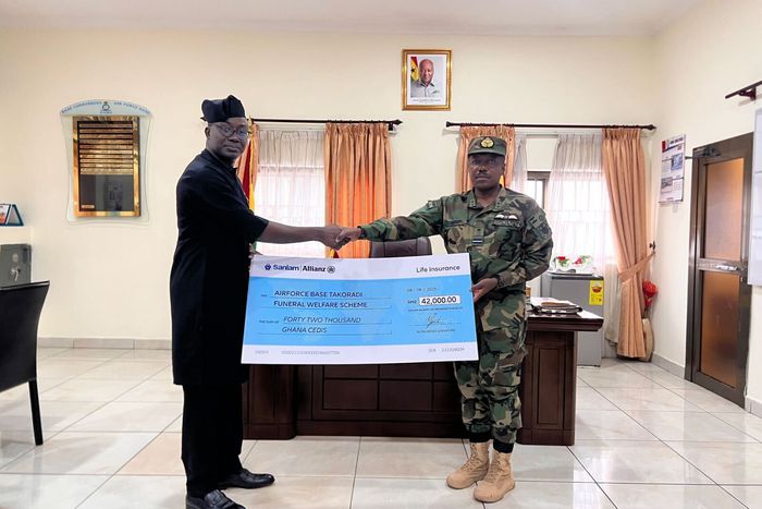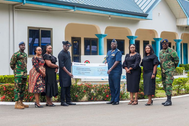 On Friday, August 08, 2025, at the Ghana Air Force Base (Burma Camp), the CEO/Country Lead of Sanlam Allianz Life Insurance Ghana LTD, Tawiah BEN- AHMED, FCIIG, presented and paid the claim of Forty-Two Thousand Ghana Cedis (GH₵42,000.00) to the leadership of the Ghana Air Force, represented by Air Vice Marshal Eric Agyen-Frempong, Chief of the Air Staff, Air Force Headquarters; Air