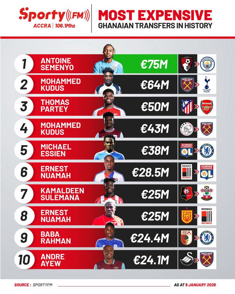 It also reflects the growing financial weight of Ghanaian players in Europe’s top leagues, particularly in England, where several Black Stars have commanded premium fees in recent years.