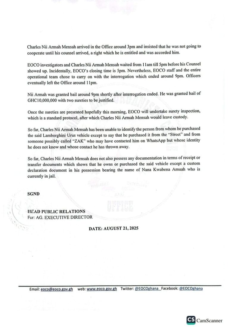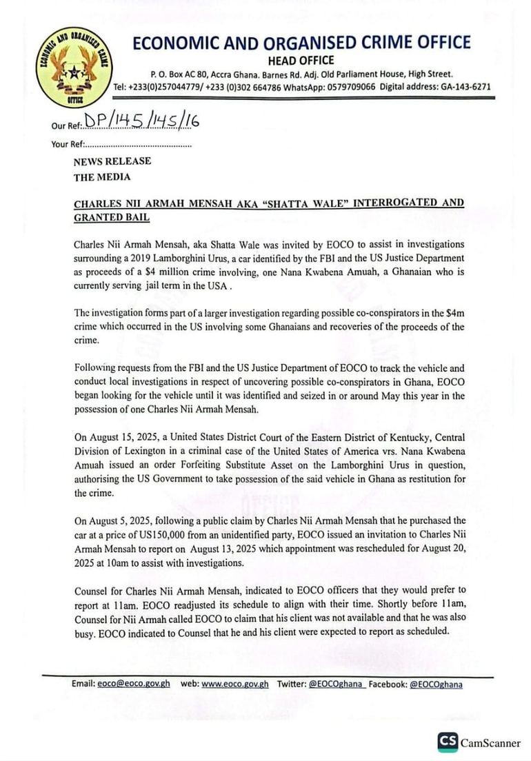 The investigation focuses on alleged irregularities involving the luxury vehicle, which was earlier seized by EOCO on suspicion of being linked to a wider financial scandal in the United States. Officials are also examining possible breaches of Ghana’s tax regulations in connection with the car.