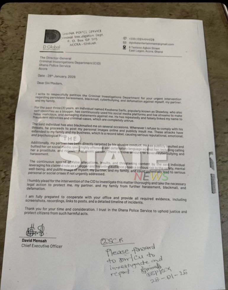 Ghanaian entertainer Sam Kwabena Safo Junior, popularly known as Showboy, has reportedly been taken into custody by officers from the Criminal Investigation Department (CID) over an alleged blackmail case involving entrepreneur and music executive David Mensah, widely known as Davido GH.