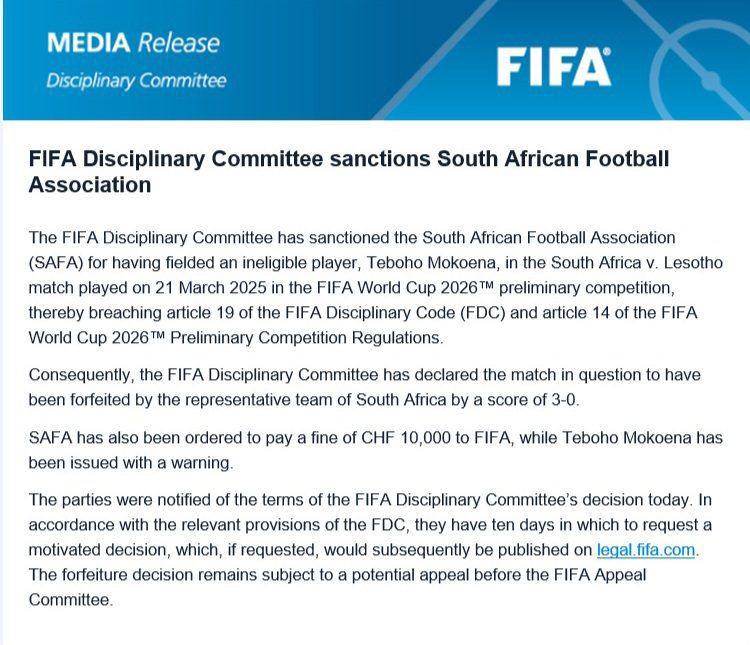 The South African Football Association (SAFA) has been hit with sanctions by FIFA’s Disciplinary Committee after it was found guilty of fielding an ineligible player during the 2026 FIFA World Cup™ qualifiers.