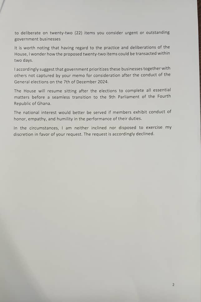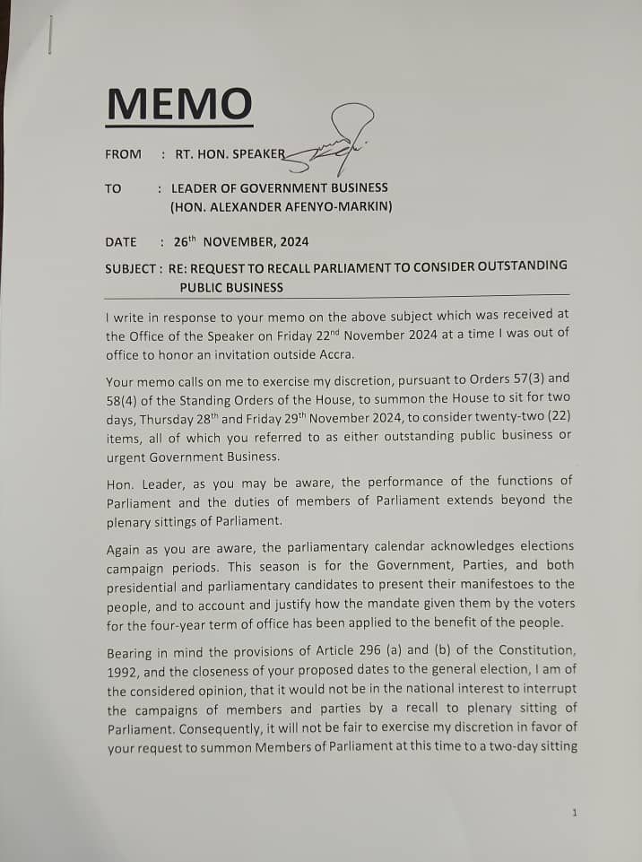 In his formal response dated 26th November, addressed to Afenyo-Markin as “Leader of government business,” Speaker Bagbin rejected the request, citing the election season's importance and the impracticality of addressing such extensive business in two days.