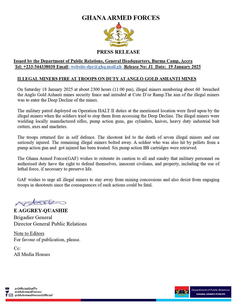 In a statement released on January 19, the GAF reported the events of the clash, providing details on the resulting deaths and injuries. According to the GAF, about 60 illegal miners intruded the Anglo Gold Ashanti mines at Cote D’or Ramp, with the intention of entering the Deep Decline of the mines.
