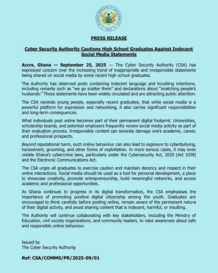 The Cyber Security Authority (CSA) has issued a strong caution to recent senior high school graduates over the rising trend of indecent language and disturbing remarks on social media.