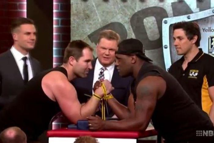 Ex-rugby players, Wendell Sailor and Ben Ross, made an appearance on The Footy Show – a talk show in Australia – and engaged in an arm-wrestling match that really didn’t end well.