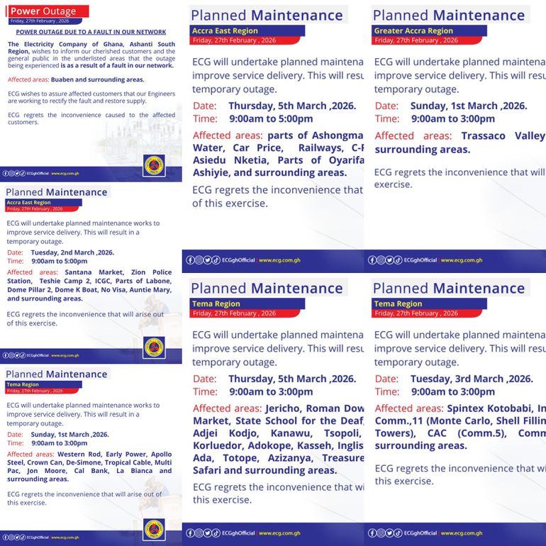 The Electricity Company of Ghana (ECG) has announced a series of planned and emergency maintenance works across its operational regions, set to take place from Sunday, 1 March, through Thursday, 5 March