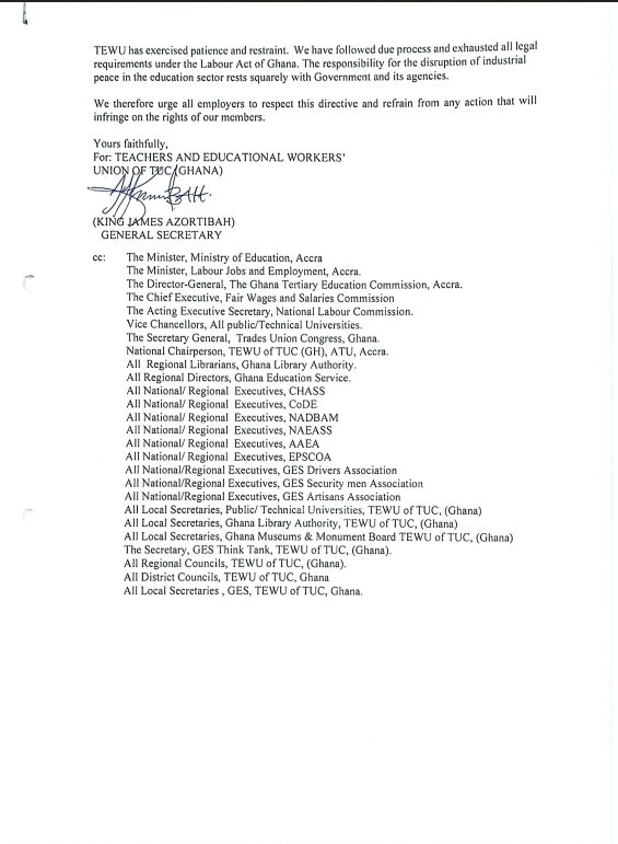 Copies of the declaration have been sent to the Ministry of Education, Ministry of Labour, GES, the Ghana Tertiary Education Commission, and the National Labour Commission. TEWU has urged all employer institutions to respect the lawful decision of its members.