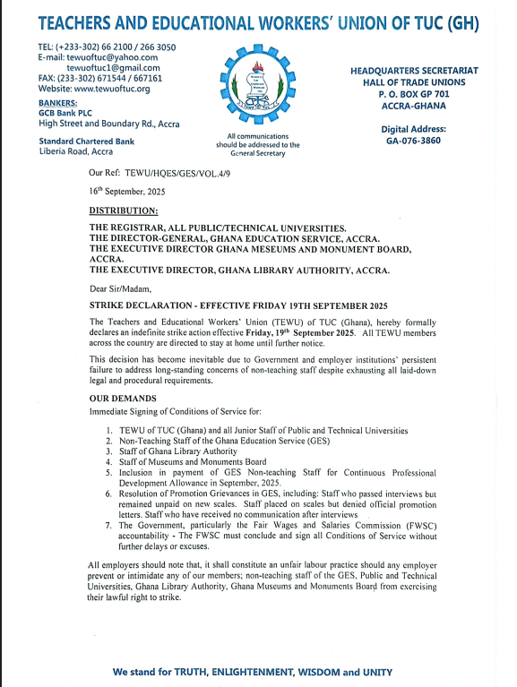 The Teachers and Educational Workers’ Union (TEWU) of TUC (Ghana) has declared an indefinite nationwide strike effective Friday, September 19, 2025, throwing the country’s education sector into uncertainty.