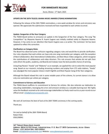 The Telecel Ghana Music Awards (TGMA) Board has responded to concerns over the omission of King Paluta’s song Makoma from this year’s nominations.