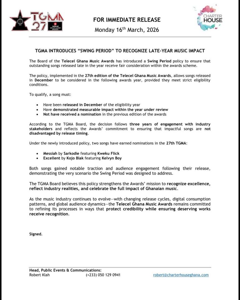 The organisers of the Telecel Ghana Music Awards have introduced a new “Swing Period” policy aimed at ensuring songs released late in the year receive fair consideration within the awards scheme.