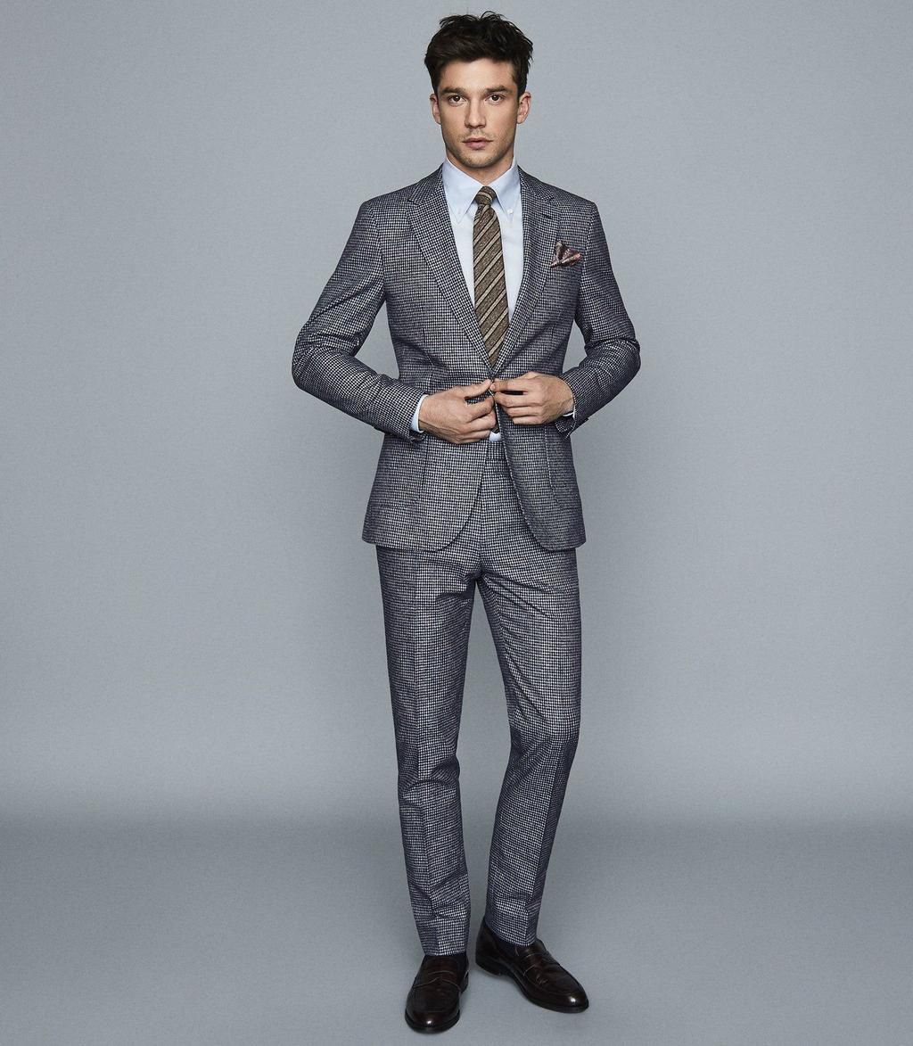 Reiss Leon Cotton-Linen Blend Slim-Fit Suit Jacket, $520.00 BUY IT HERE Pants, $240.00 BUY IT HERE If youre in the market for a darker suit, consider a lightweight option like this one with some stretch to work in the summer. Reiss