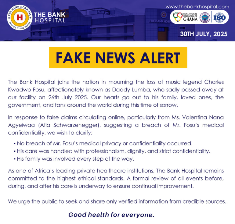 The Bank Hospital has denied allegations of breaching the medical confidentiality of the late Ghanaian highlife icon, Charles Kwadwo Fosu, affectionately known as Daddy Lumba, who passed away at the facility on 26 July.