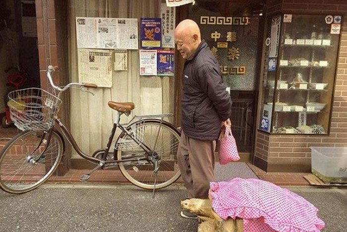 A Japanese man and his adorable pet tortoise have become internet sensations after photos of them strolling along the streets of Tokyo went viral. The man – funeral director Mitani Hisao – revealed that the tortoise has been his pet for the past 19 years, taking the place of the child he never had.