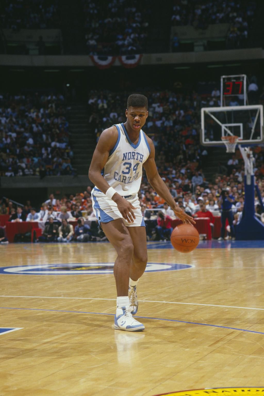 1987: The Sweet 16 North Carolina player, J.R. Reid, dribbles the ball down the court during the 1987 tournament's Sweet 16 round. North Carolina had earned the title of Atlantic Coast Conference champions during the same year and made it to the top eight in the NCAA tournament. Focus On Sport - Getty Images