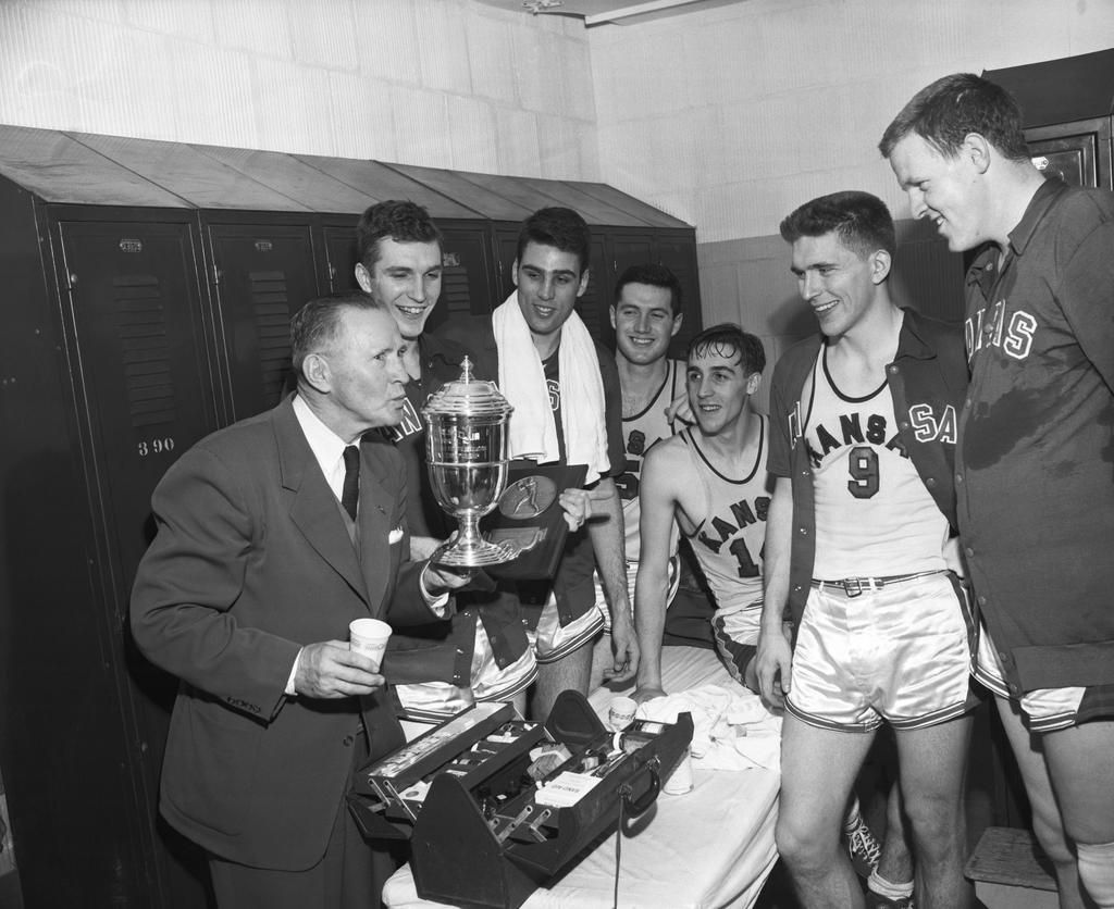 1952: Expanding the Tournament The coach of the victorious University of Kansas basketball team prepares to kiss the winning trophy in their locker room. A year prior, the tournament was expanded to include sixteen college teams, instead of just eight. Bettmann - Getty Images