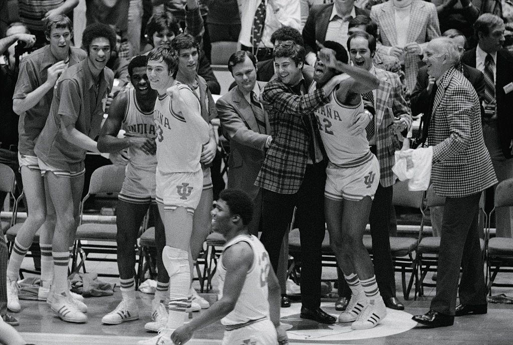1976: Indiana Celebrates Their Win Indiana University Bloomington coach Bobby Knight celebrates with his players as they secure a victory against the University of Michigan in NCAA championship. Bettmann - Getty Images