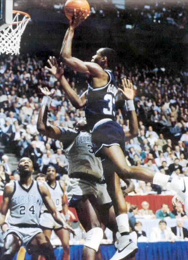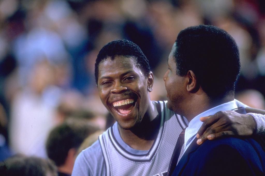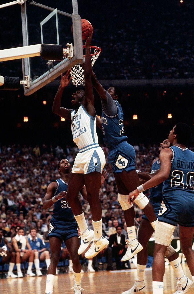 1982: Michael Jordan vs. Patrick Ewing Michael Jordan scores despite a close guard from Georgetown player Patrick Ewing. The two future NBA stars faced off in the Final Four game, which North Carolina ultimately won. Wally McNamee - Getty Images