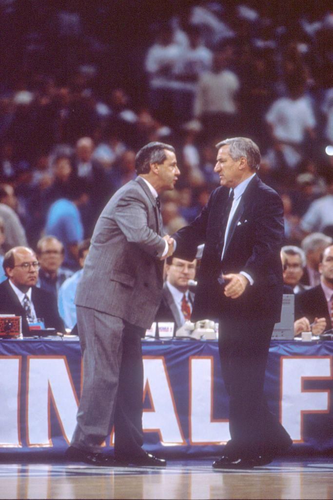 1993: A Future Partnership After a major loss in the Final Four, University of Kansas coach, Roy Williamswho would go on to coach the opposing team in 2003 until present dayshakes the hand of North Carolina's head coach, Dean Smith. The game ended in a North Carolina victory. NCAA Photos - Getty Images