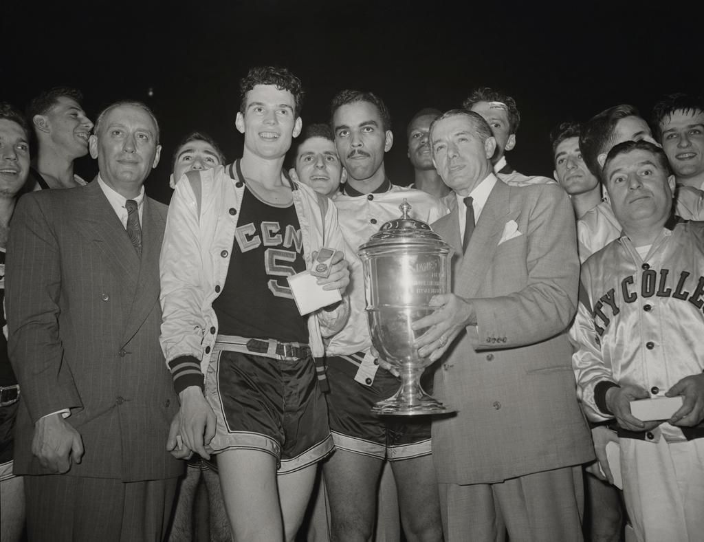 1950: A Victory for City College The City College of New York clenched the title over Bradley University in the 1950 tournament. Here, the winning team gathers around their coach with their trophy. Bettmann - Getty Images