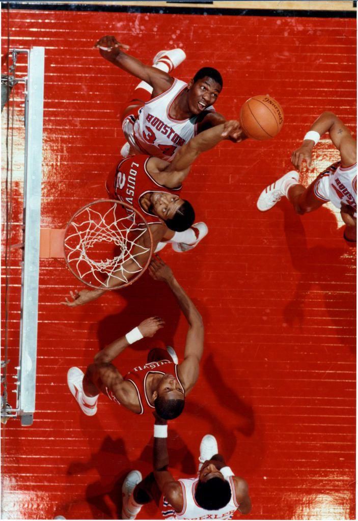 1983: A Close Matchup In a game that would decide who played North Carolina State in the championship, Houston defeated Louisville 80-68. Here, Houston's Hakeem Olajuwon fights for the ball under the net with Louisville's Rodney McCray. Louisville would later fall to North Carolina State, resulting in NC State's second title. NCAA Photos - Getty Images