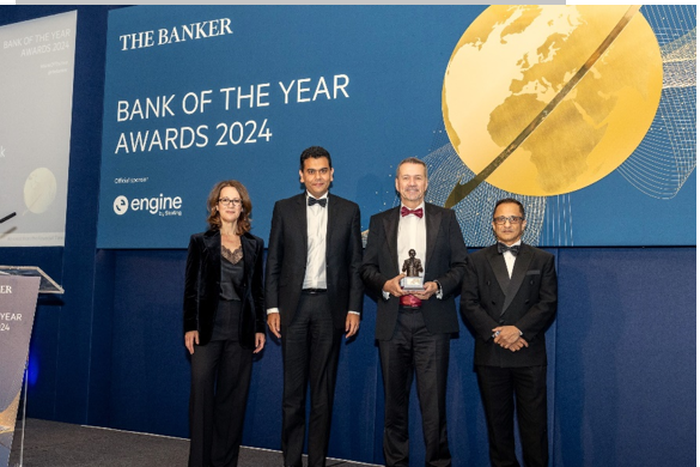 MCB’s CEO, Thierry Hebraud, in company of Dipak Chummun, Chief Finance Officer, MCB Group, and Ashvin Deena, Head of Global and International Corporates received the coveted award at The Bank of The Year Awards 2024, organised by The Banker Magazine, a publication of the Financial Times, on Wednesday 4th December in London.